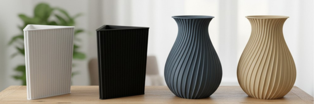 Durch den schichtweisen Aufbau im 3D-Druck entstehen feine Strukturen, die jede Vase zu einem individuellen Designobjekt machen – sicht- und spürbar.