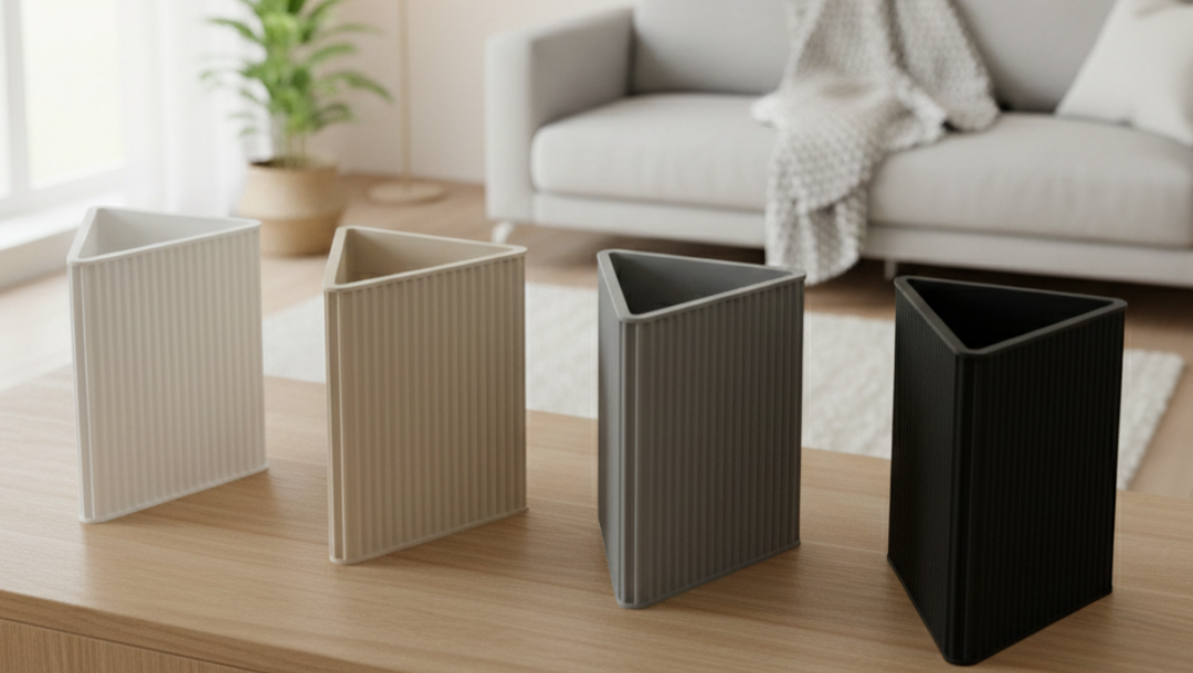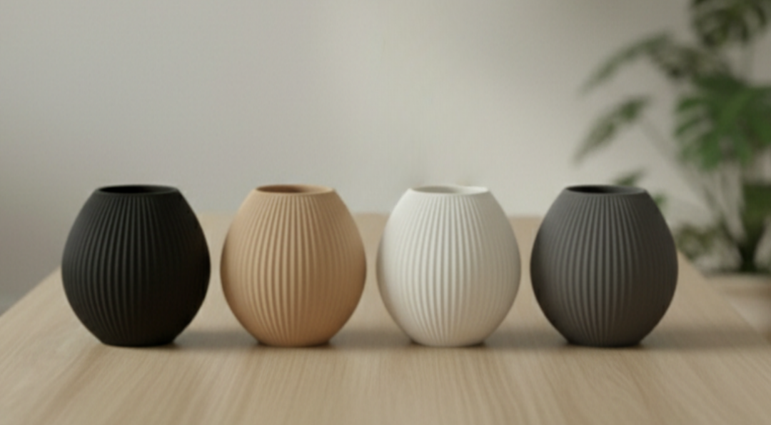 Zeitlose Vasen und Wohnaccessoires aus biobasiertem PLA, regional produziert, minimalistisch im Design – für Räume voller Ruhe und Stil.